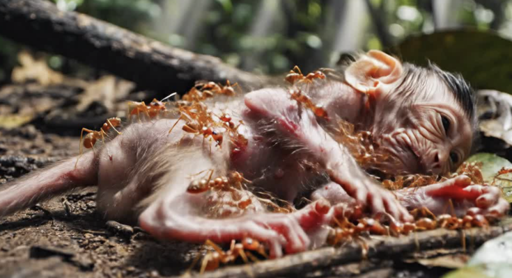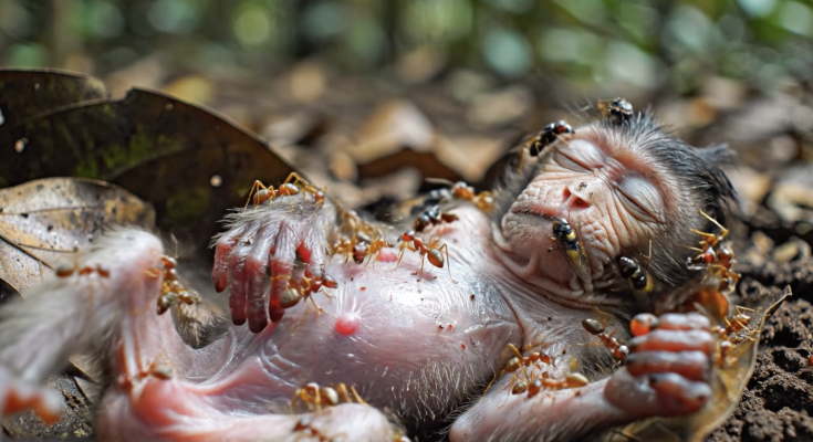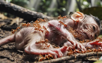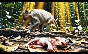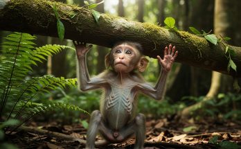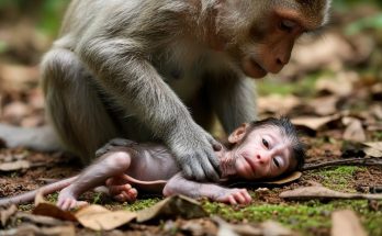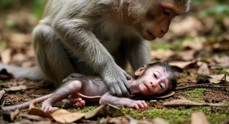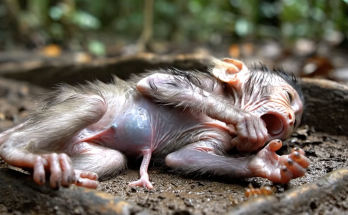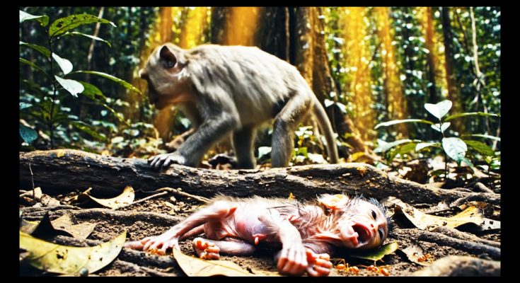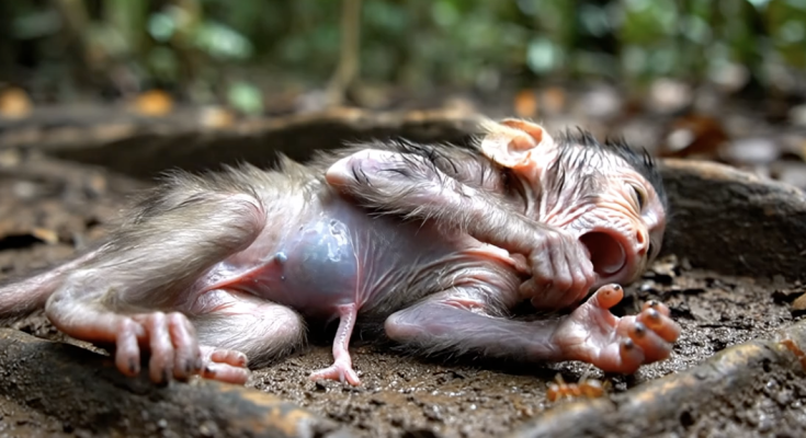The forest lay heavy with heat, the kind that clung to every leaf and root like a damp blanket. Deep within the undergrowth, the newborn monkey lay sprawled on the …