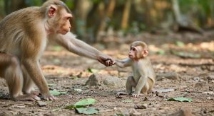 The mother monkey sat high in the trees, her baby pressed safely against her chest. The little one was half asleep, tiny fingers curled tightly into her fur. The forest was calm, filled with soft sunlight and the sound of birds.