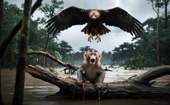 The monkey had tried to move away, fear flashing briefly in his eyes. But his body was too tired. He could only watch as the dog sat nearby, keeping a respectful distance. The dog lay down, lowered his head, and waited.