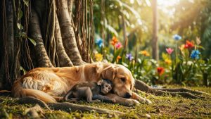 A small monkey was sleeping peacefully next to a gentle dog under the shade of a large tree. Sunlight filtered softly through wide green leaves, painting moving patterns on the ground. The forest, usually loud and restless, seemed to pause and breathe quietly around them.