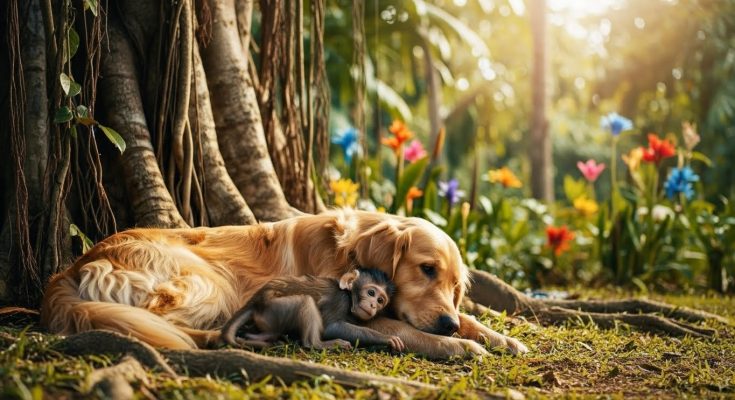 The dog lifted his head once when a distant sound echoed through the forest. His body tensed slightly, muscles ready. The monkey did not wake. He slept deeply, his trust complete. After a moment, when no danger followed, the dog relaxed again, lowering his head carefully so as not to disturb him.