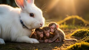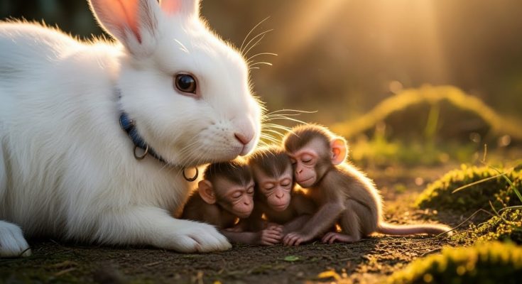In a forest shaped by survival, something gentle existed in that clearing. A white rabbit sitting quietly, filled with compassion and love. Three little monkeys sleeping close together. No fear. No urgency. Just a shared moment of kindness.