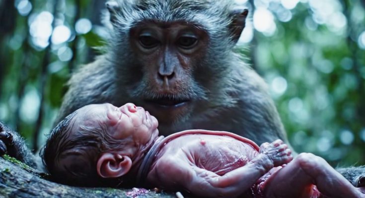 Under the broad arch of a moss-covered branch, a mother monkey named Lila sat curled in a protective cradle formed by the roots of the tree. Her eyes, warm and deep like polished amber, flickered with both exhaustion and anticipation. For days, the troop had noticed her slowing movements, the way she guarded her belly, and how she often chose solitude instead of play or foraging. And now, finally, the moment had arrived.