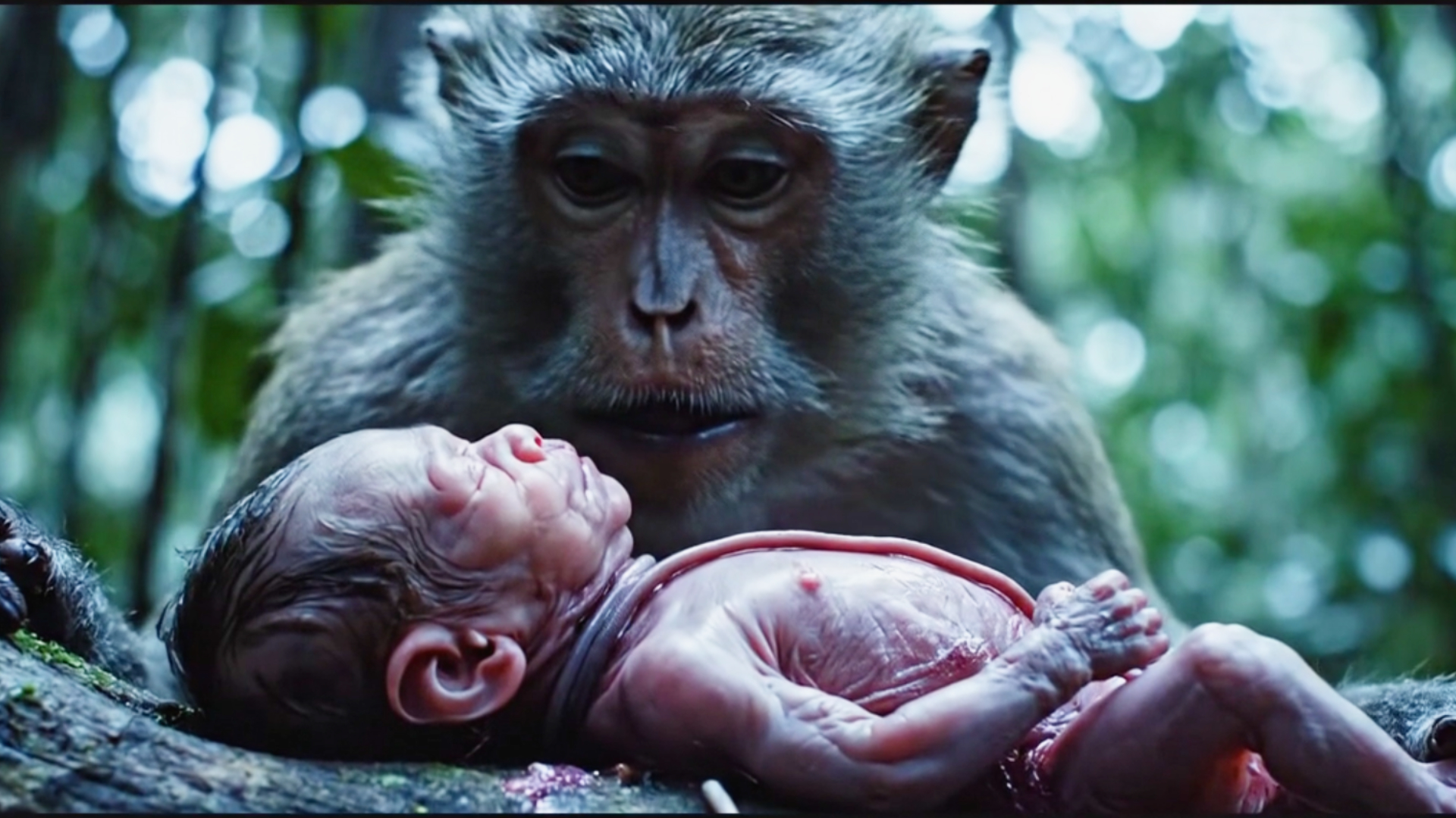 Under the broad arch of a moss-covered branch, a mother monkey named Lila sat curled in a protective cradle formed by the roots of the tree. Her eyes, warm and deep like polished amber, flickered with both exhaustion and anticipation. For days, the troop had noticed her slowing movements, the way she guarded her belly, and how she often chose solitude instead of play or foraging. And now, finally, the moment had arrived.