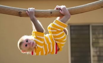 The baby monkey clung tightly to the high branch, his tiny fingers locked around the rough bark. Below him, the ground looked far away—too far. His legs trembled, and his …