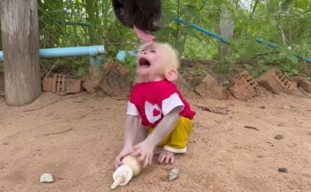 The orphaned baby monkey cried softly, its small voice weak from hunger and exhaustion. Its tiny body trembled as it lay curled on the ground, too tired to move much …