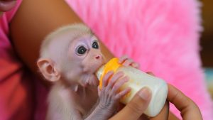 The caregiver gently lifted a small bottle filled with warm milk and brought it closer. The baby monkey’s eyes widened in confusion. He stared at the bottle, tilting his head, unsure whether to fear it or explore it. His stomach rumbled softly, betraying his hunger.