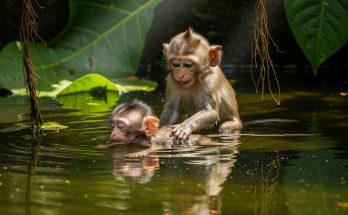 The mother monkey screamed from above and rushed down the tree as fast as she could. Her heart was pounding, her eyes wide with fear. She reached her baby and gently lifted its fragile body, holding it close to her chest. The baby whimpered, its arm twisted awkwardly, its body trembling with shock.