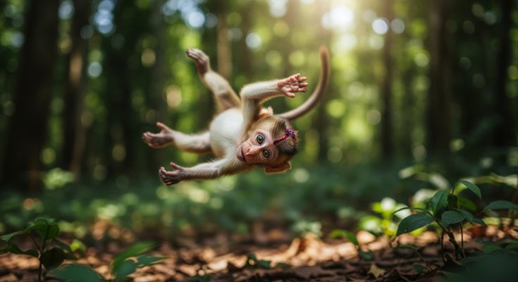 A sudden gust of wind bent the fragile branch the baby was standing on. It cracked sharply under its weight. Before it could react, the baby monkey slipped. Its hands scratched desperately at the bark, but it couldn’t find a grip. In a blink, its small body was falling through the air.