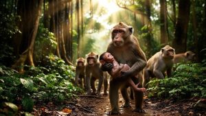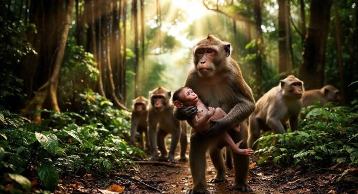 The forest glowed softly with morning light as the troop began their slow journey across the canopy. Branches rustled under their nimble feet. Birds called through the treetops. Sunbeams danced between leaves like strands of gold. In the middle of this gentle movement, Yuna walked carefully, her arms wrapped around a tiny, sleeping baby monkey.