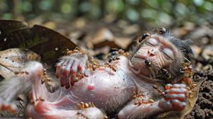 Around the baby, insects began to gather. Tiny flies buzzed near its face, circling for a landing. Ants marched in determined lines, crawling over dried leaves and roots, drawn by the scent of something vulnerable and unmoving. One fly landed briefly on the infant’s cheek, its legs brushing the soft skin before darting away again. The baby didn’t react. It couldn’t. The strength to even swat at the tiny intruders was far beyond its reach.