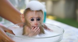 The mother monkey sat near a shallow stream, holding her baby close. The little one had slept deeply through the night, his fur messy, his face marked with dried milk and tiny bits of leaf. He blinked sleepily, yawning wide, unaware that his morning bath was about to begin.