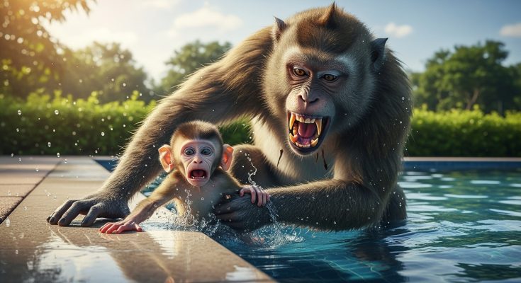 She grabbed her baby’s arm just as its body slipped fully over the ledge. The baby screamed, its hand clasping onto its mother’s wrist, clinging for dear life. The big monkey roared in frustration, pounding the stone with his fists. He wanted control. He wanted power. And in that moment, he wanted the baby in the water.