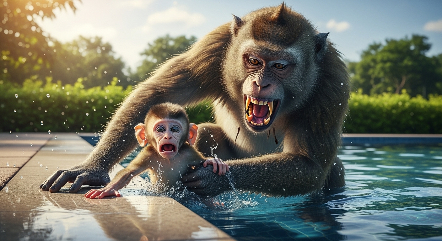 The baby clung desperately, its nails scraping against the rock. The big monkey leaned forward, pressing harder, testing the baby’s resistance. The pool below glittered with sunlight, its surface broken by gentle ripples. It wasn’t deep, but for a baby monkey with no strength and no swimming ability, it was a deadly trap.