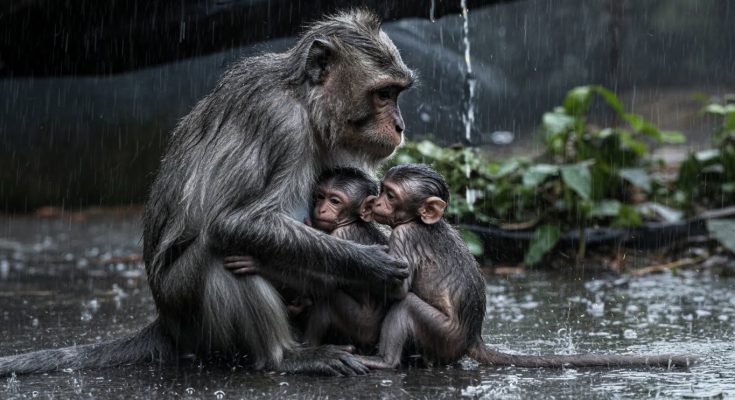 Brave Mother Monkey Shields All Her Babies From Heavy Rainstorm – Won’t Give Up