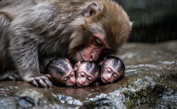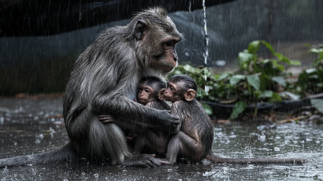 Brave Mother Monkey Shields All Her Babies From Heavy Rainstorm – Won’t Give Up