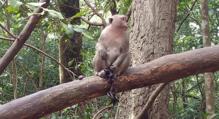The mother monkey sat alone on a broken branch, rain dripping from the leaves above her. Her body was thin, tired, and covered with old wounds that never fully healed. In her arms lay her baby—small, weak, and quiet. The world around them felt cold and unforgiving, yet she held on, refusing to let go.