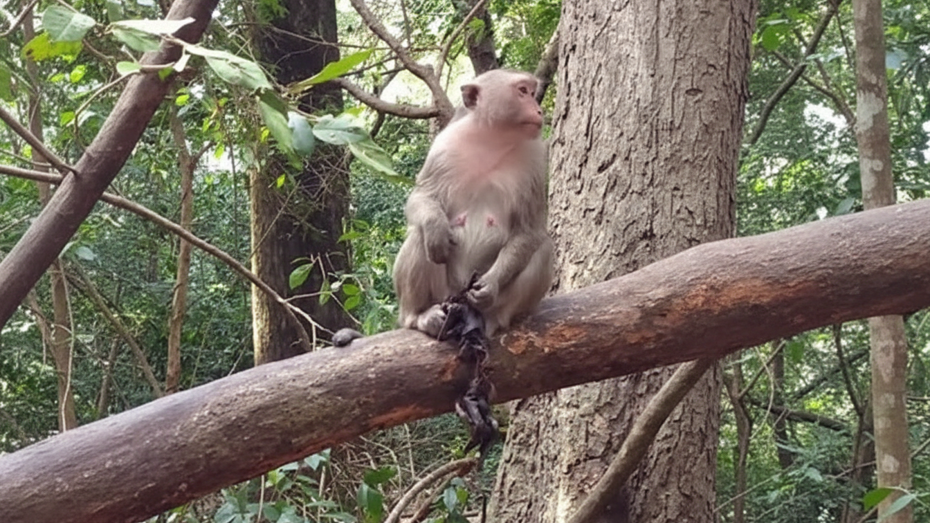 The mother monkey sat alone on a broken branch, rain dripping from the leaves above her. Her body was thin, tired, and covered with old wounds that never fully healed. In her arms lay her baby—small, weak, and quiet. The world around them felt cold and unforgiving, yet she held on, refusing to let go.