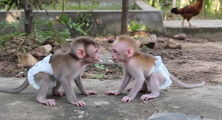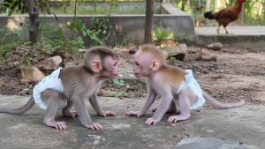 The cute baby monkeys were happy to play, even though their little bodies were already tired. Their faces were bright with joy, eyes shining as they moved and tumbled around, forgetting for a moment how exhausted they truly were.