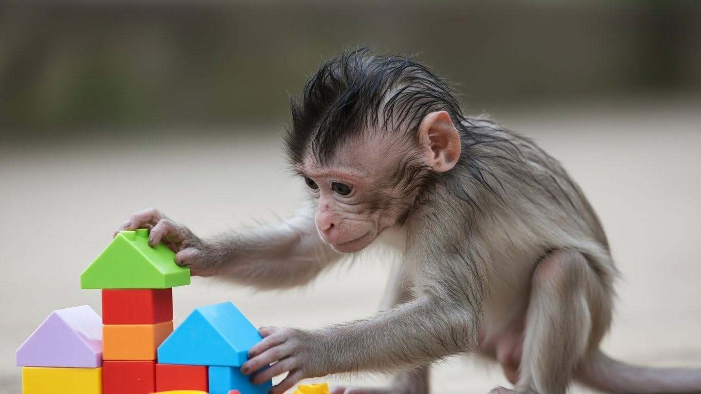The baby monkey placed the red block on top of a blue one. It wobbled, then fell. The monkey froze for a moment, eyes wide in surprise. Then, instead of fear or frustration, a soft chatter escaped its mouth—half laugh, half excitement. It tried again.