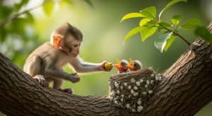 Cute Tiny Baby Monkey Climbing to the Tree to Feed Baby Birds