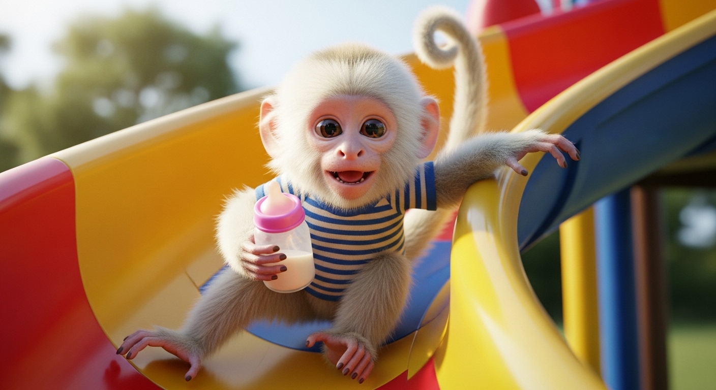 And so, the cute white baby monkey continued his days — drinking milk, learning, growing, and playing. The memory of that little slide became just another story in his early life — a reminder that even the gentlest creatures face small tumbles, yet always find the strength to get back up, hold their bottle tight, and smile once more.