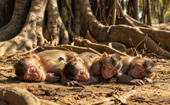Dinner time for a monkey family is more than just eating—it’s a ritual of connection. The group settles into a loose circle, some perched on thick limbs, others crouched on sturdy roots. At the center, the spoils of their day’s foraging are shared. Fruits with bright, fragrant skins are passed from hand to hand; tender leaves are plucked and chewed slowly; seeds and pods are cracked open with skillful fingers and nimble teeth. No one eats entirely alone—sharing is a quiet but constant act among them.