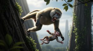 The older monkeys had begun fighting. It started with screeches and warning growls, but soon, furious leaps and sharp claws turned the place into a storm of violence. They bared their teeth, pulling and shoving, their tails lashing the air. The baby monkey, caught in the middle of this chaos, tried to crawl back to safety. His little hands shook as he reached for the branch above, but before he could climb away, the fighters crashed into him.
