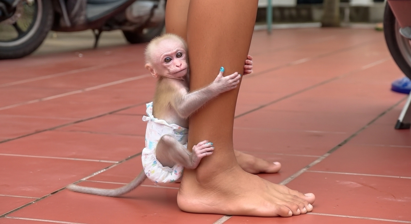 The baby monkey was very small and very tired. His steps were slow, uneven, and unsure, but still—he followed the father. Every few steps, he stumbled, almost falling, then stood again. His eyes were heavy with exhaustion, yet they stayed fixed on one figure ahead of him.