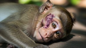 The baby monkey lay quietly on a soft pile of leaves beneath a tall forest tree. His body was very small, but his mouth looked strangely big against his thin, tired face. When he opened it, it wasn’t to laugh or chatter like other babies. It was to breathe, slowly and painfully, as sickness weighed heavily on his tiny chest.