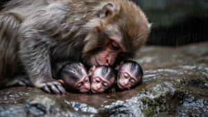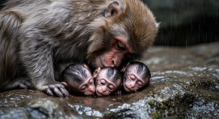 Another monkey settled nearby, blocking some of the wind with his body. Others gathered around, forming a loose barrier against the storm. They groomed Lina’s soaked fur, removing debris, stimulating warmth. One brought a broad leaf and positioned it above the baby, adding extra shelter.