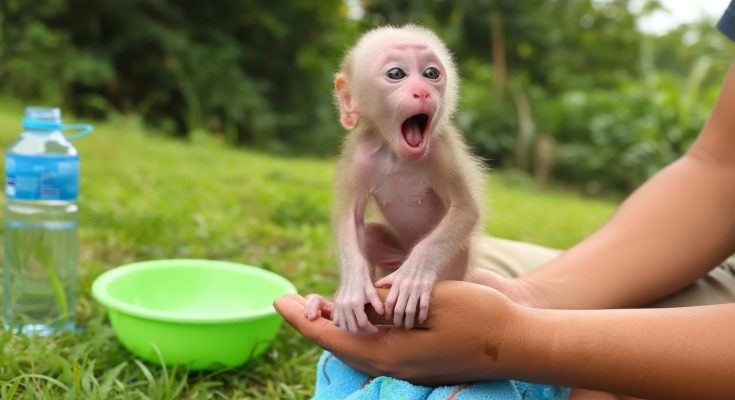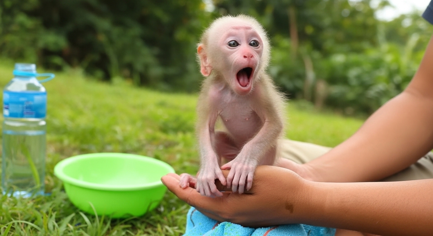 The baby monkey sat on the cold ground, his tiny stomach pressed inward as it growled again. The sound startled him, and he began to cry. His mouth opened wide, his lips trembling as a desperate sound escaped.
