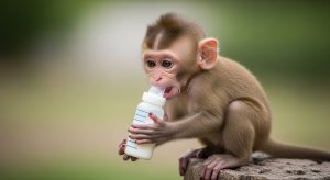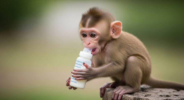 The morning sun had just begun to rise over the quiet village, painting the rooftops in soft gold. In a small corner near the caretaker’s porch, a tiny baby monkey sat alone, clutching a milk bottle almost as big as its head. His fur was thin and pale brown, his eyes wide with hunger and need.