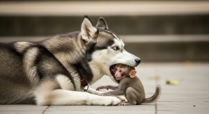 The baby monkey was full of energy, his tiny feet moving quickly as he ran near the husky. His laughter sounded like high-pitched squeaks, echoing across the garden. The husky barked joyfully, lowering his head and playfully jumping forward. For a while, they played like two best friends, pure and happy. But as the game grew wilder, the husky’s excitement turned rough. His big body moved faster, his teeth flashing white in the sunlight as he tried to grab the monkey’s tail in fun.
