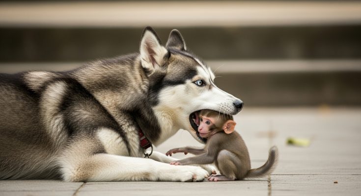 The baby monkey didn’t understand the danger. He thought it was still a game. He squeaked loudly, running in small circles, waving his arms as if teasing the husky. The husky barked again, louder this time, his tail wagging so hard that it brushed against the flower bushes. Then, suddenly, in one quick motion of instinct and play — the husky opened his mouth and bit.