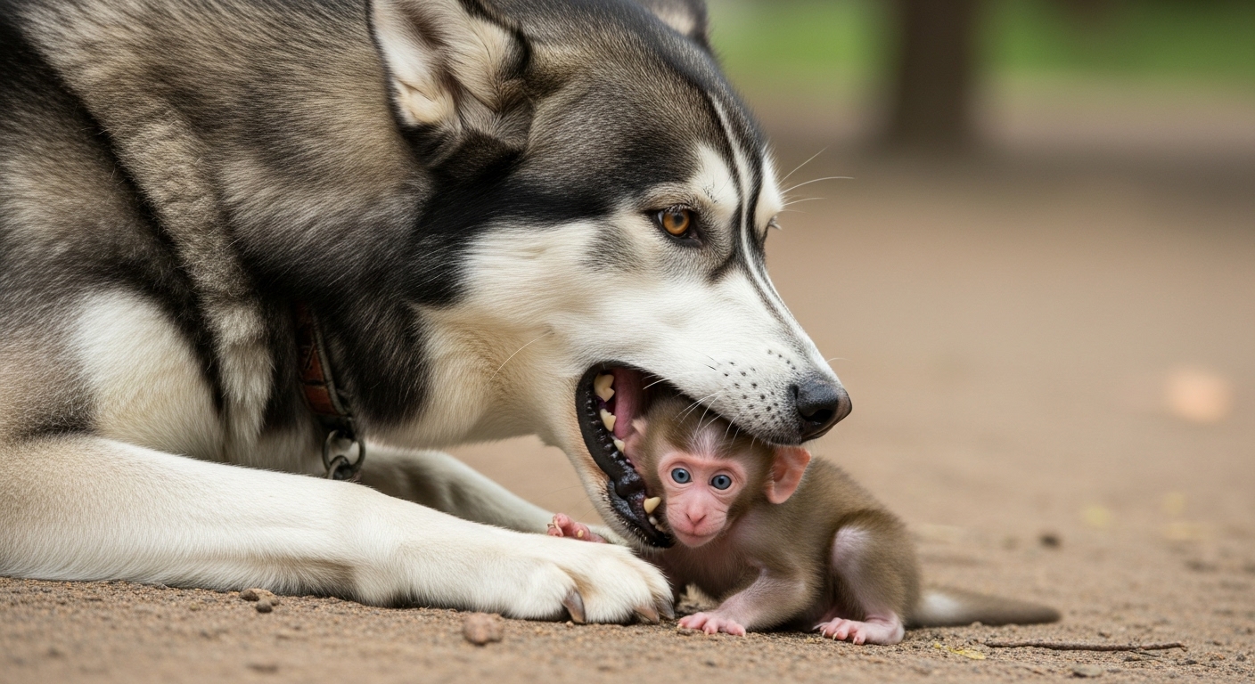 Before she could reach him, the husky grabbed the baby monkey in his strong jaws. Not out of cruelty—out of instinct. But the result was the same.