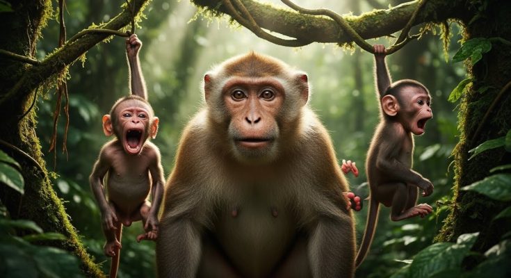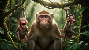 In the middle of a deep forest full of mystery and danger, a mother monkey sat firmly on a thick branch, her eyes filled with worry. The trees around her were ancient and tall, their tangled roots hiding secrets beneath the earth, their branches weaving shadows that never truly slept. Every sound carried meaning here. Every silence carried threat.