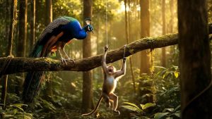 Soon, the troop retreated into the safety of the branches. The baby peeked out once more, his eyes searching the clearing below. He saw the peacock still standing there, feathers glowing in the fading sunlight.
