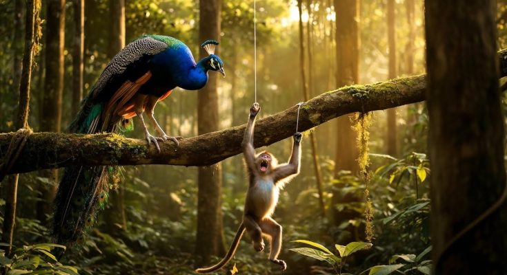 The baby monkey hit the peacock’s open tail feathers instead of the hard ground.