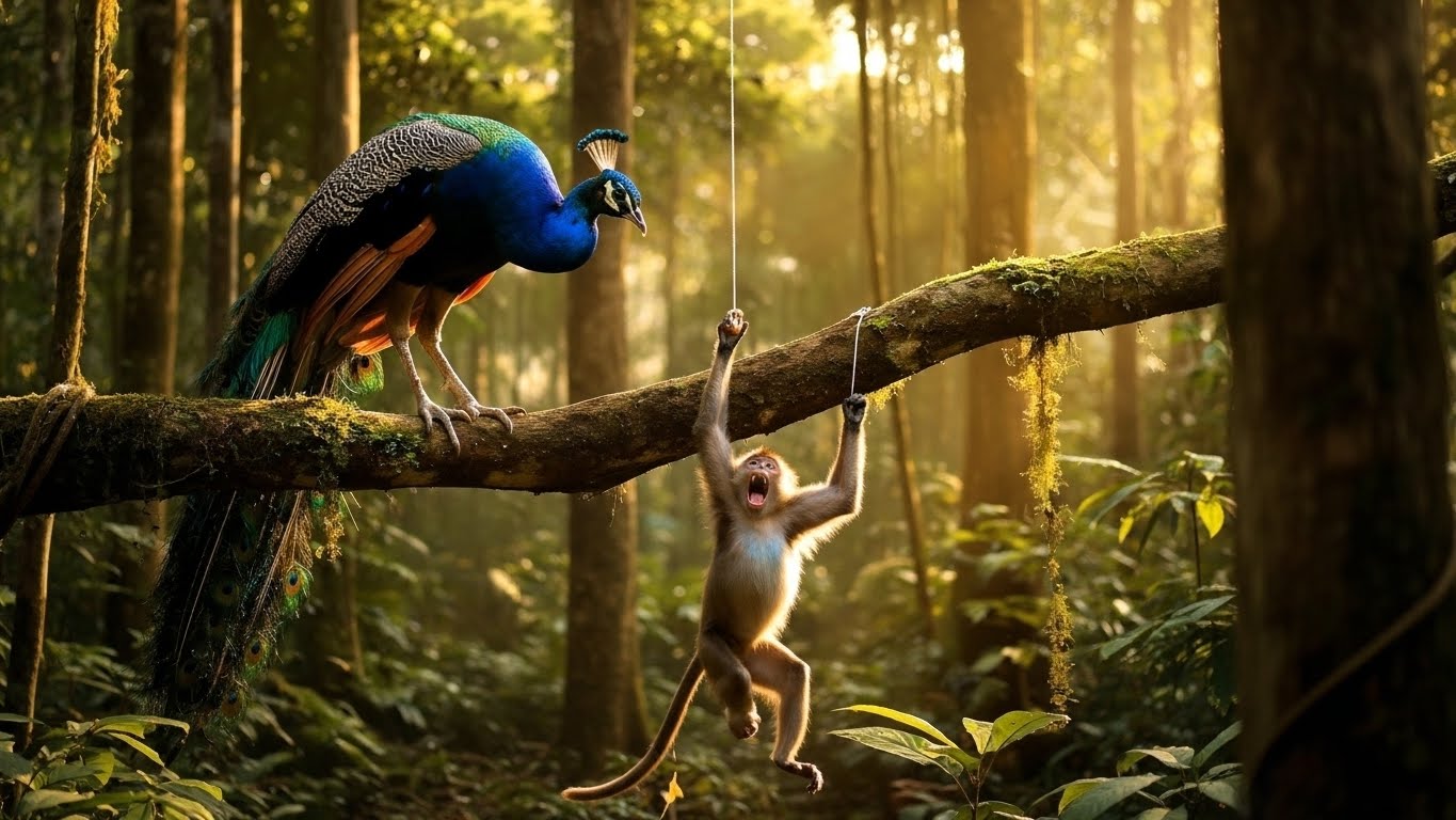 The baby monkey slowly pushed himself upright. He looked at the peacock, then at the massive, shimmering feathers around him. His fear eased just enough for curiosity to creep in.
