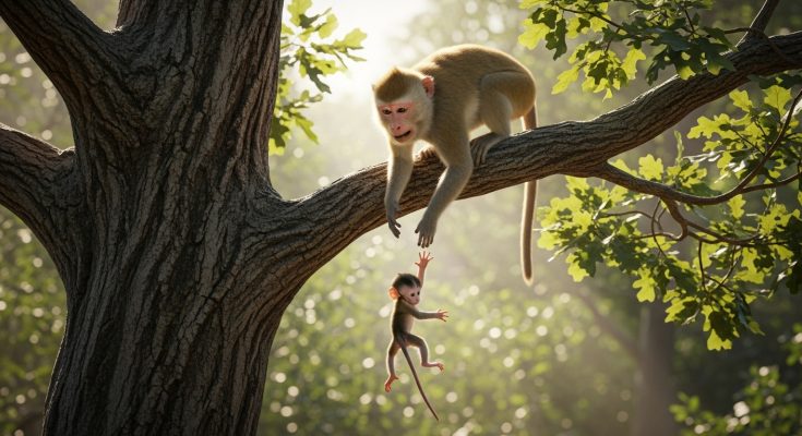 The forest was alive with morning light, golden rays slicing through the thick canopy, illuminating the dew-laden leaves. A chorus of birds filled the air, and distant insects hummed their steady rhythm. Among the tall trees, a troop of monkeys stirred awake, stretching, grooming, and chattering in their own language of clicks and squeaks. In the midst of this awakening, a young mother cradled her newborn baby against her chest. The infant was tiny, fragile, his soft fur still damp from the night’s chill, and his eyes wide with the unsteady wonder of the first days of life.