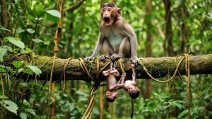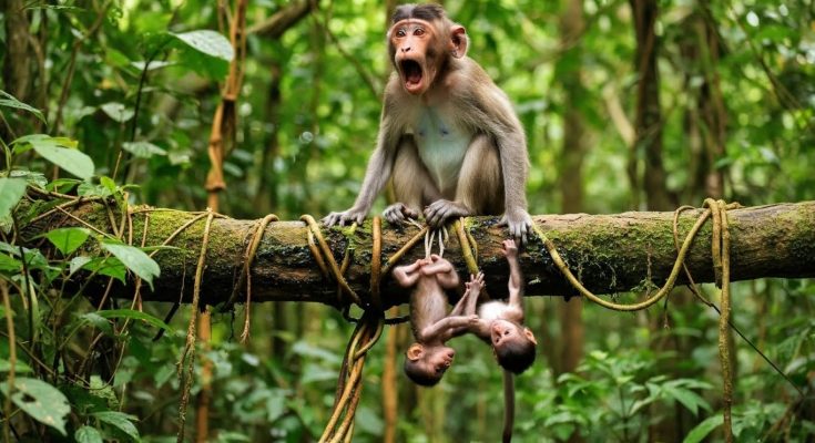 The mother monkey froze in shock, then screamed in fear as she saw her little monkeys caught in a rope beneath the tree branch. The sound tore through the forest—sharp, desperate, filled with terror no animal could mistake.