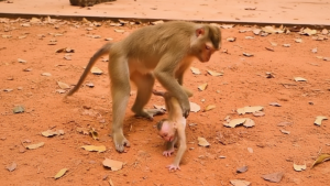 The cute baby monkey sat quietly by the small, sparkling stream, the sunlight warming its fur on a hot day. Its tiny body shivered slightly, not from cold, but from excitement and anticipation. Today was bath day, and even though the water looked cool and inviting, the baby hesitated, unsure of what to expect.