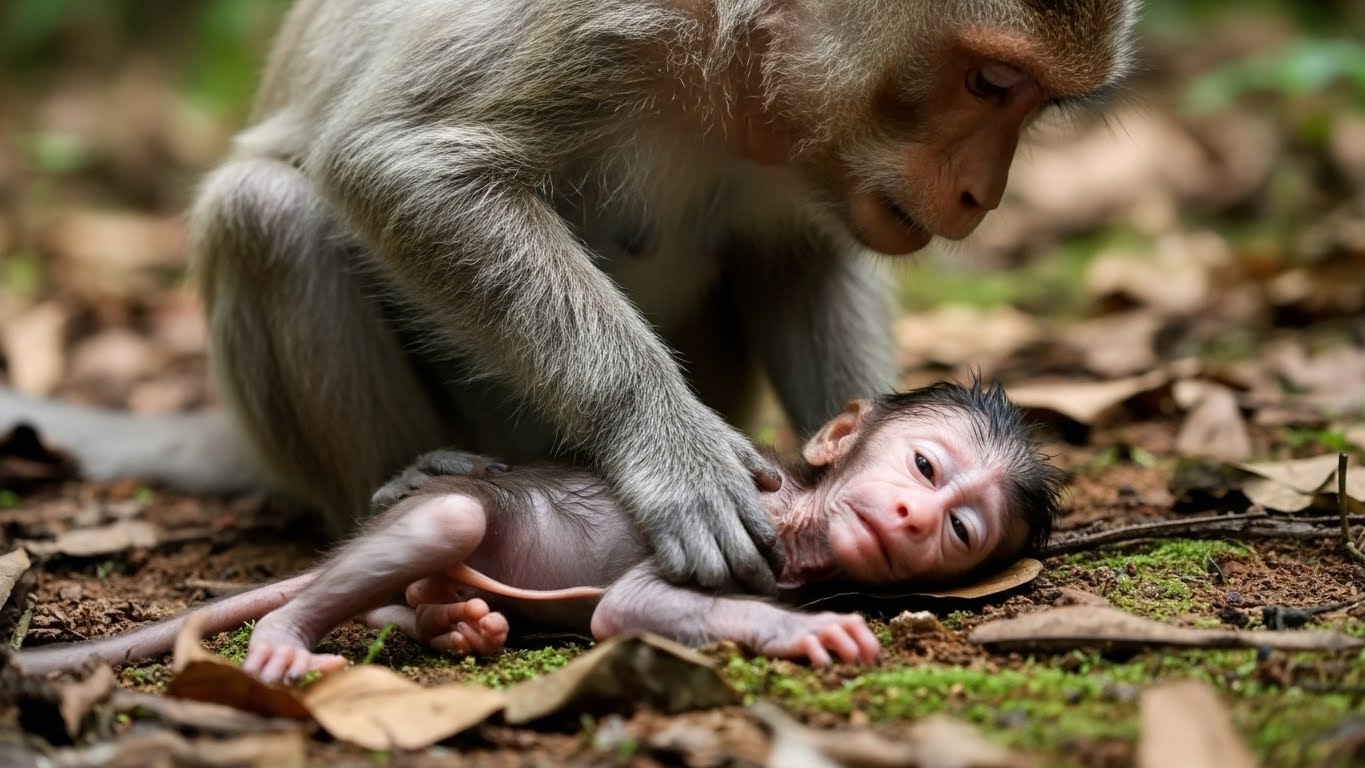 The newborn was small, far smaller than a healthy infant should be. Its skin was still wrinkled, its limbs shaking, its eyelids barely able to lift. With instinctive effort, it reached toward its mother’s chest for warmth. But the old monkey did not move. She lay still, trembling from the ordeal, her strength nearly spent. Age had taken what little energy she once had; the birth had drained the rest.