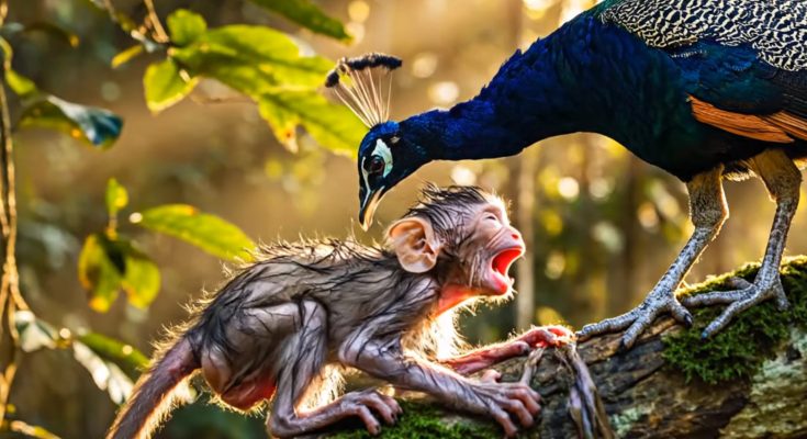 His feathers shimmered in deep blues and greens, catching the sunlight with every slow movement. The baby monkey stared, eyes wide with curiosity. He had never seen a bird like this before. Instinct told him to stay still, so he did—frozen, watching.
