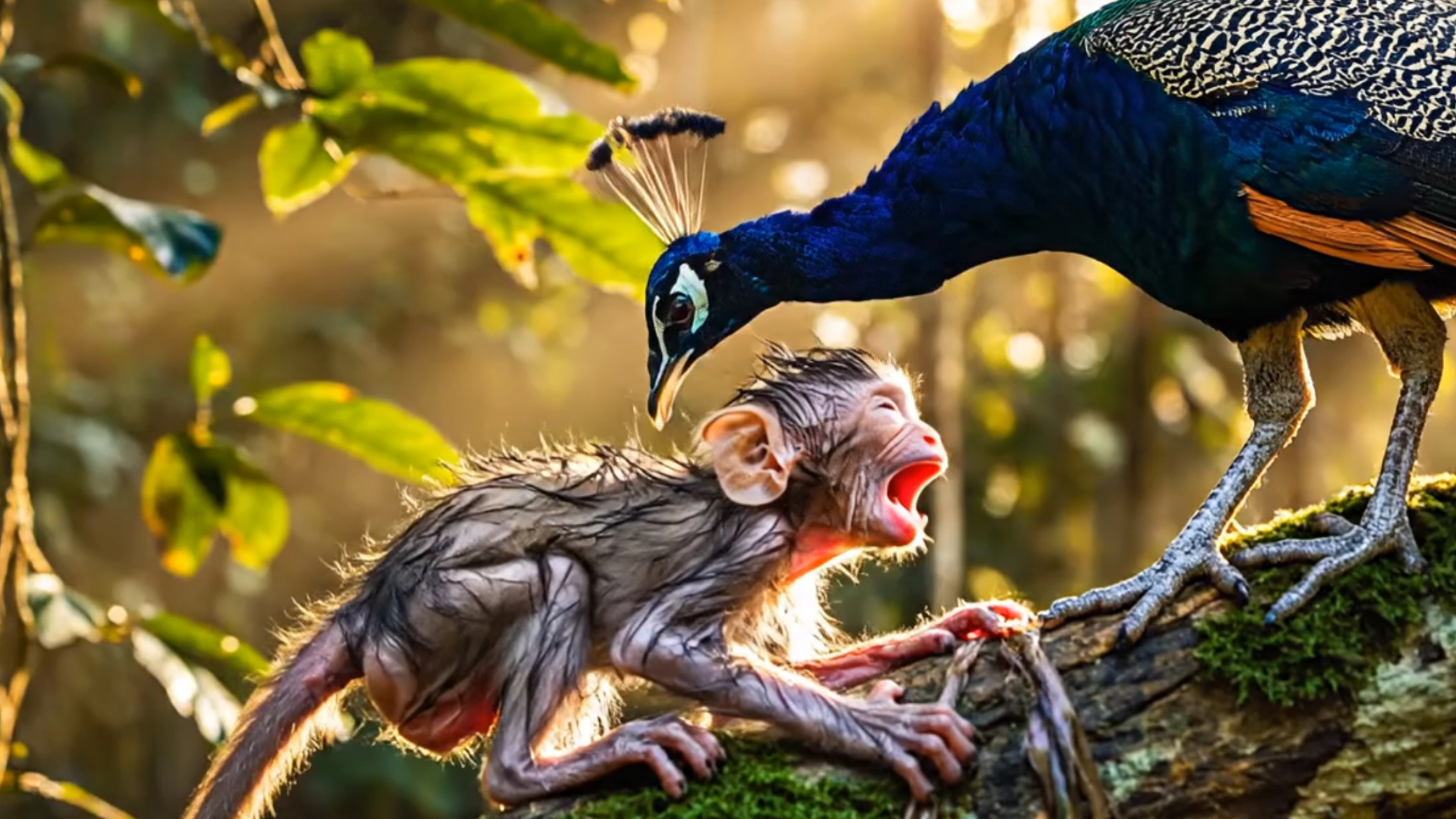 His feathers shimmered in deep blues and greens, catching the sunlight with every slow movement. The baby monkey stared, eyes wide with curiosity. He had never seen a bird like this before. Instinct told him to stay still, so he did—frozen, watching.