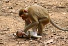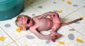 The little baby monkey sat alone on the dusty ground, his tiny body shaking as soft cries escaped his throat. His stomach hurt badly. It had been too long since he last drank milk. Hunger was no longer just a feeling—it was pain.