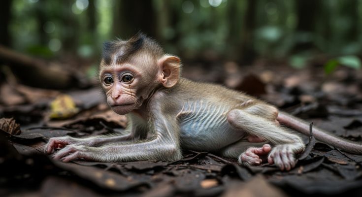 The baby monkey tried to crawl forward. He managed to move only a few centimeters before collapsing again. His body was simply too weak. His bones pressed against his thin skin, and his fur, once soft, was now dirty and clumped from the cold night dew.