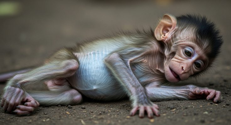 In the middle of a silent jungle morning, where the sunlight slipped softly through the leaves, a tiny newborn monkey lay curled at the base of an old tree. His body was so small, so fragile, it looked as if the slightest breeze might carry him away. His belly was swollen and heavy, round and tight, though his arms and legs were thin as twigs. He was the poorest and weakest soul in that wild forest—a newborn baby monkey fighting against sickness and starvation.