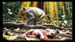 The jungle awoke with its usual chorus of birds, chattering branches, and rustling leaves—but beneath those familiar sounds, another voice trembled through the undergrowth. A newborn monkey, barely hours old, lay curled at the base of a thick tree root, its cries rising sharply into the morning air. Each sound seemed too big for its tiny body, yet desperation pushed the weak wails louder and louder. They were cries born of fear, hunger, and a confusion no newborn should ever endure.
